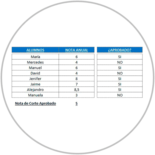 Cuando aplicamos esta fórmula, tal y como podemos ver en la imagen abajo, el resultado es el que esperamos, y hemos obtenido como resultado de la fórmula, “SI” Y “NO”. “SI” serían los aprobados del curso, “NO” los alumnos que no han cumplido con la condición, que si recordamos era sacar un 5 o más en la nota anual del curso.