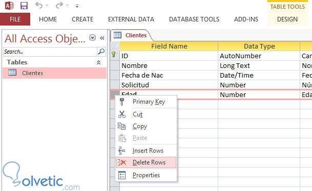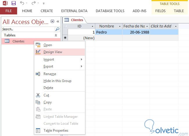 1- Para acceder a la Vista de Diseño, buscamos la tabla creada por defecto, en este caso la llamamos Clientes, hacemos click derecho y seleccionamos Vista de Diseño: