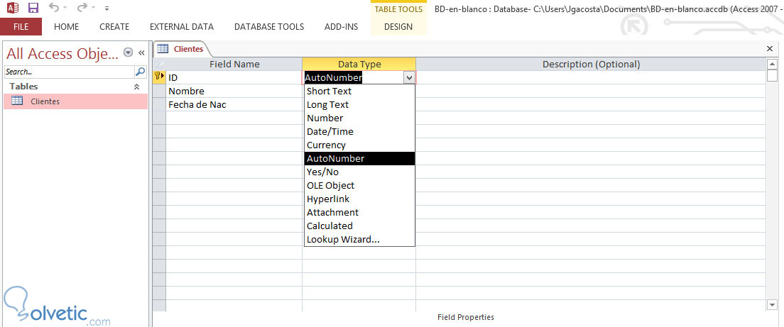Ya que hemos identificado los componentes de la Vista de Diseño veamos cómo podemos refinar la tabla que Access crea por defecto, agregando y eliminando campos, cambiando el tipo de dato y agregando un caption a cada campo: