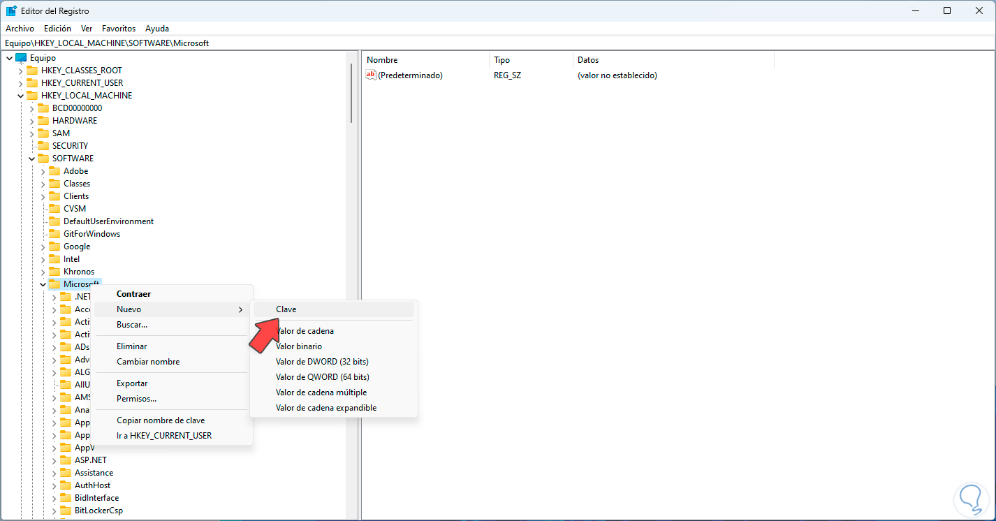 Allí, damos clic derecho sobre “Microsoft”, luego damos clic en “Nuevo – Clave”: