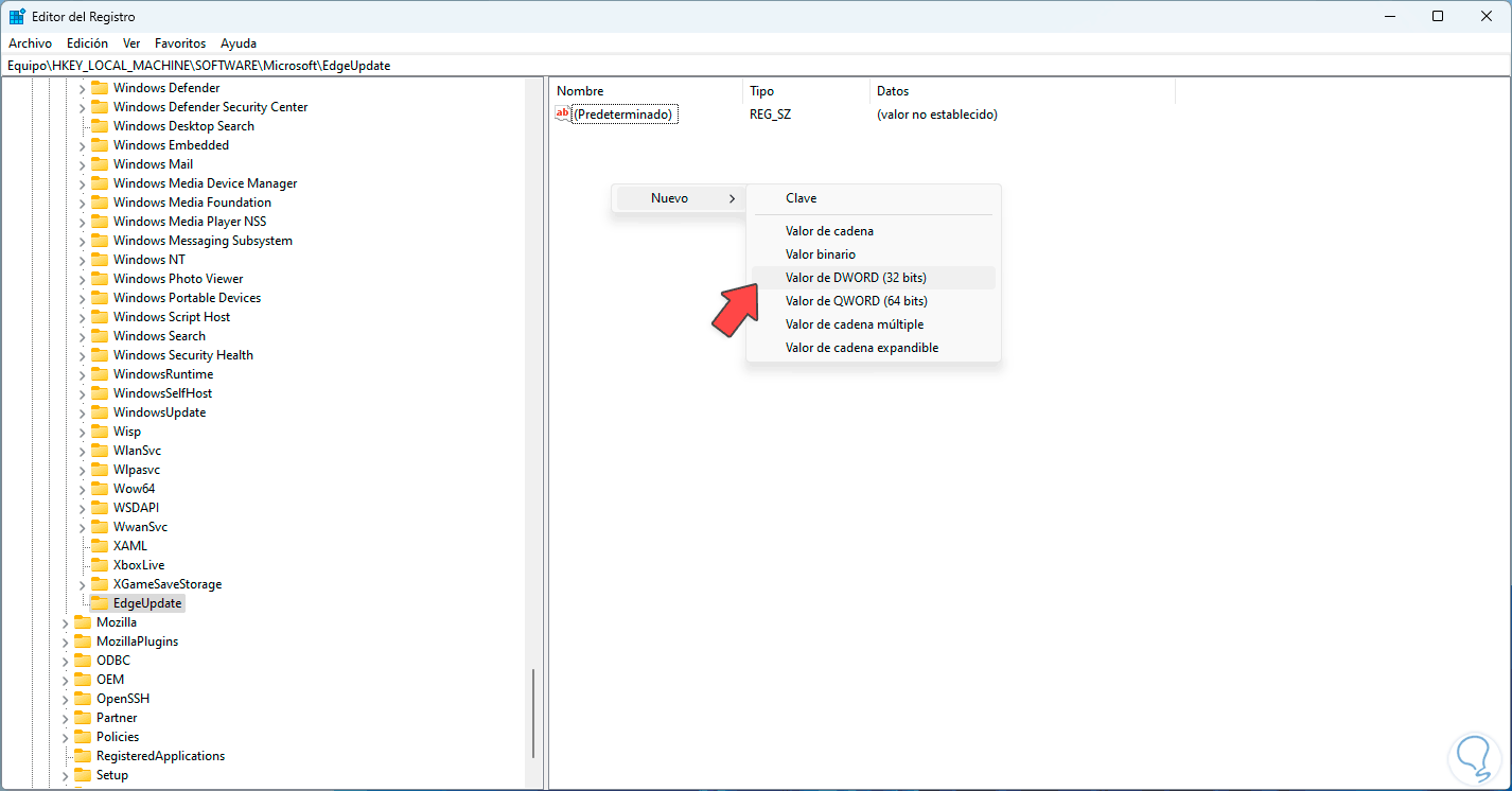 Luego, en algún lugar libre, damos clic derecho y seleccionamos la opción “Nuevo – Valor de DWORD (32 bits)”: