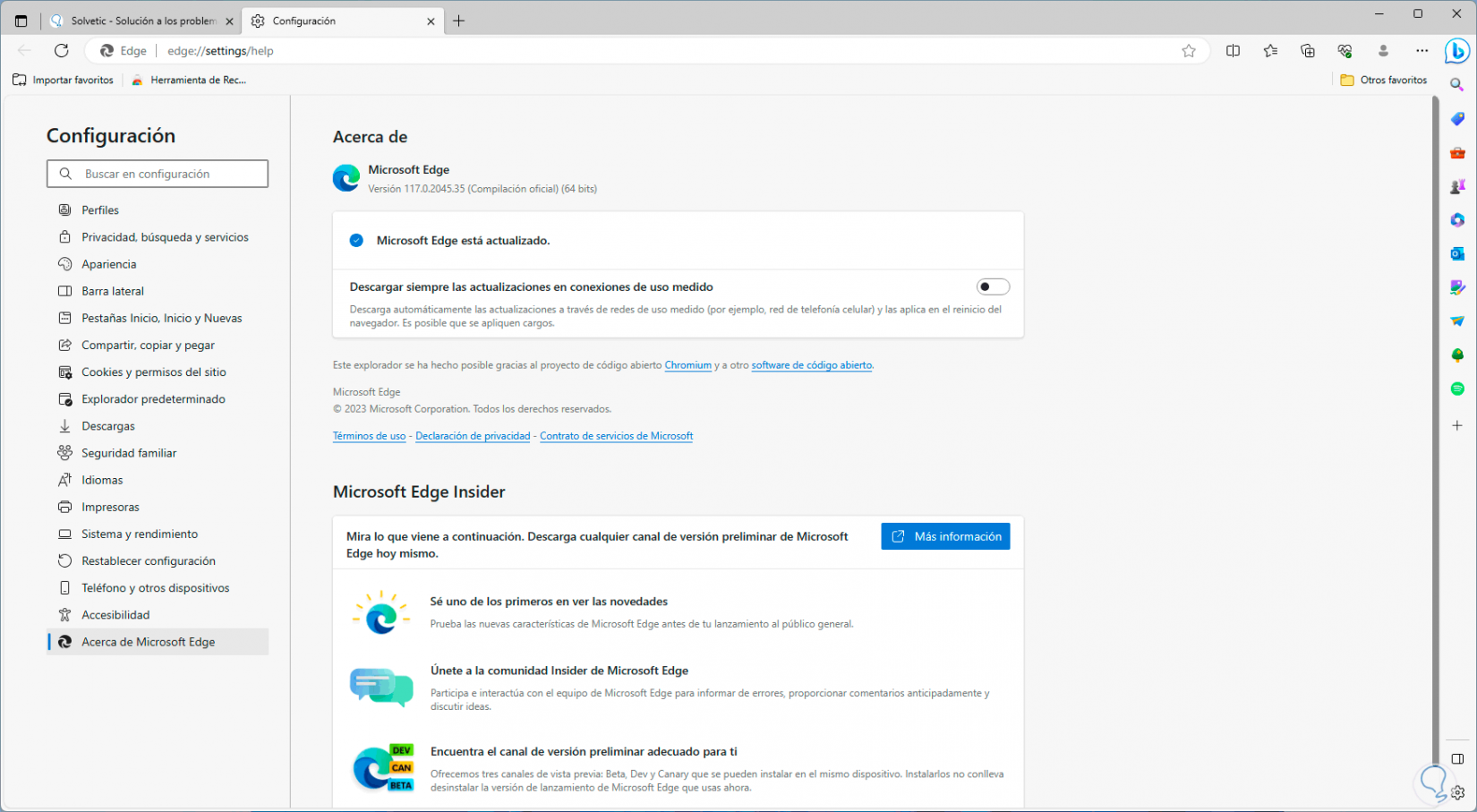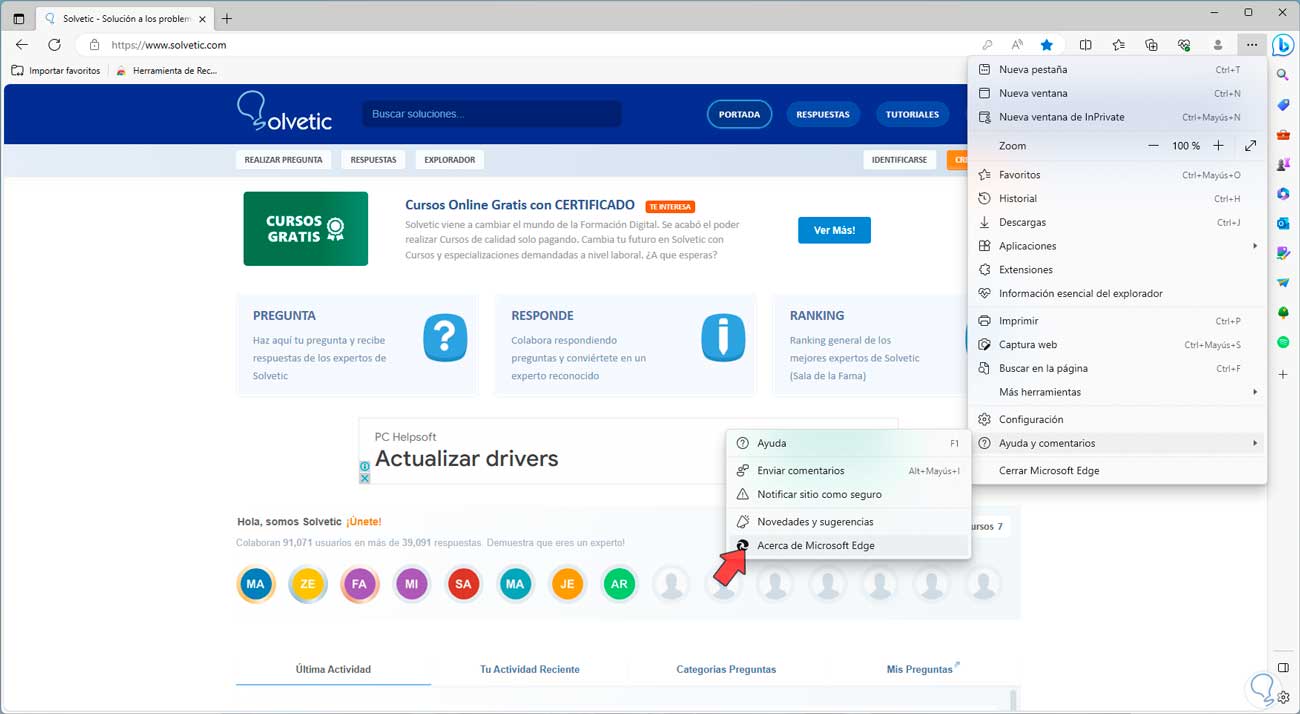 En primer lugar debemos conocer la version usada de Edge, para esto, abrimos el navegador y vamos a: