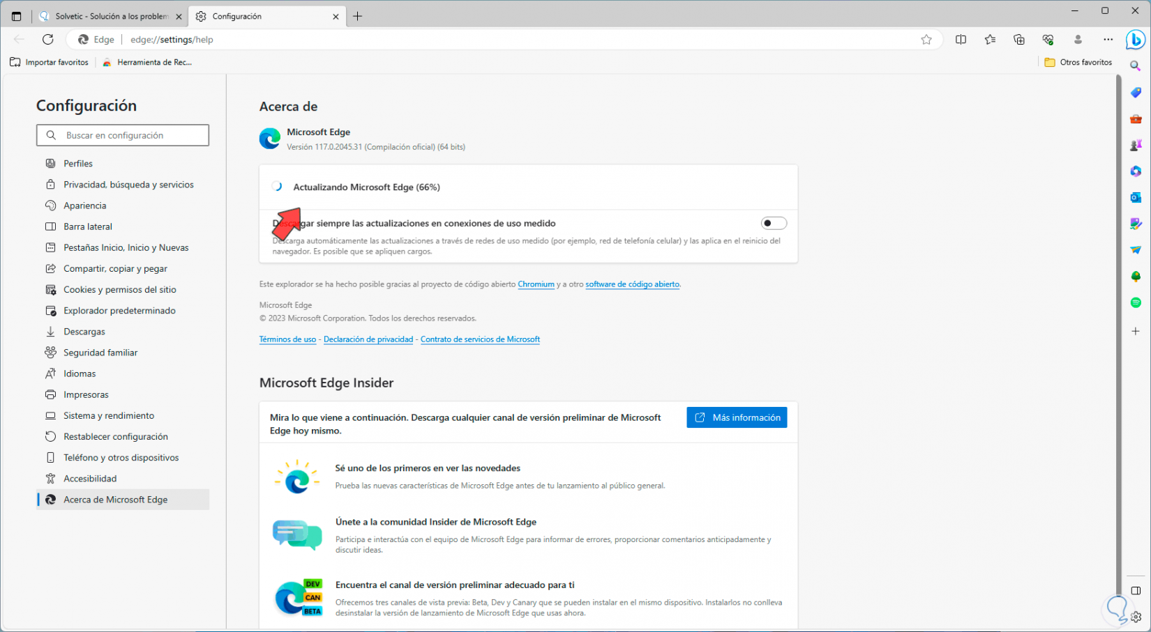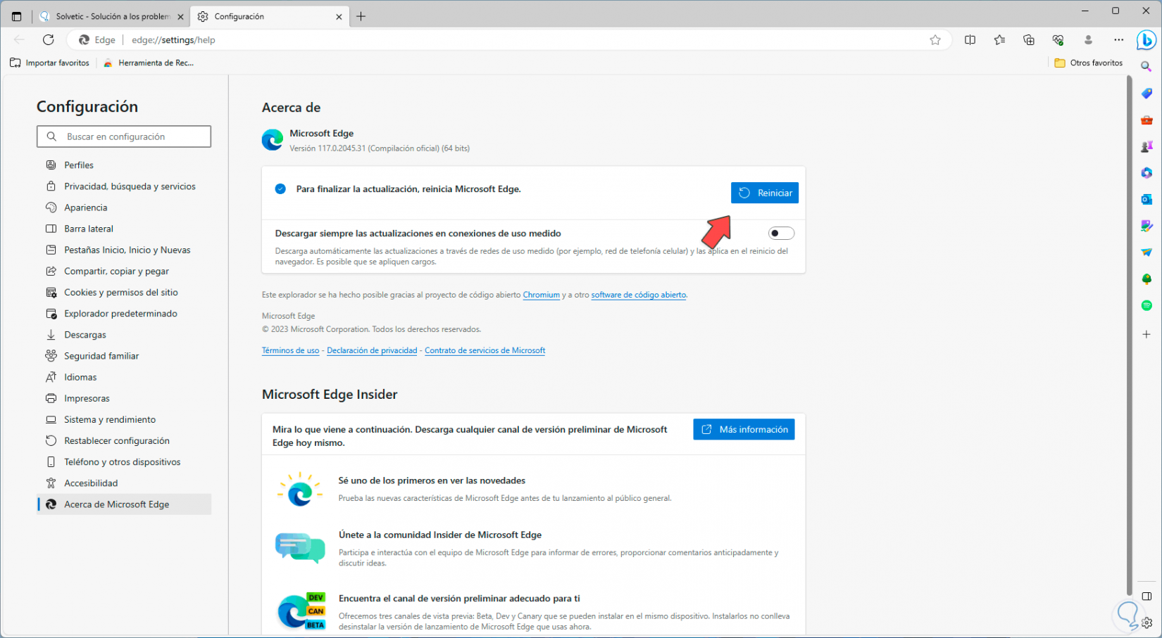 Si existen, de manera automática se descargarán e instalarán a, finalizar veremos lo siguiente. Allí damos clic en “Reiniciar” para confirmar los cambios, al acceder de nuevo al navegador veremos la version del navegador Edge: