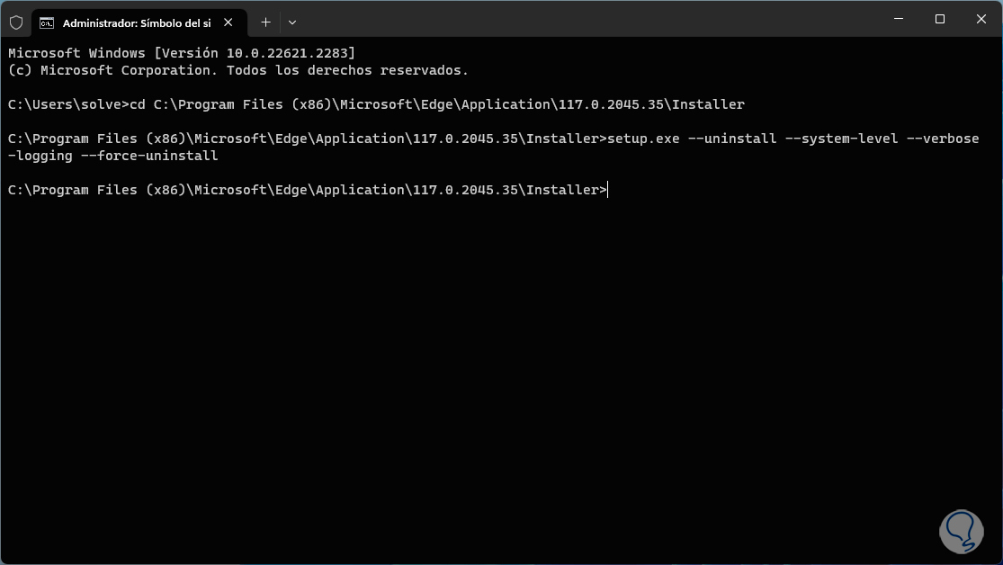 Ahora, ejecutamos el siguiente comando para proceder con la desinstalación de Microsoft Edge: