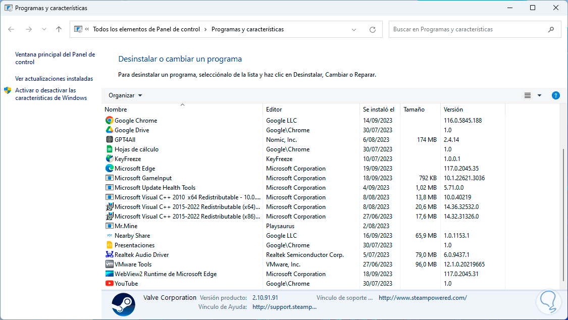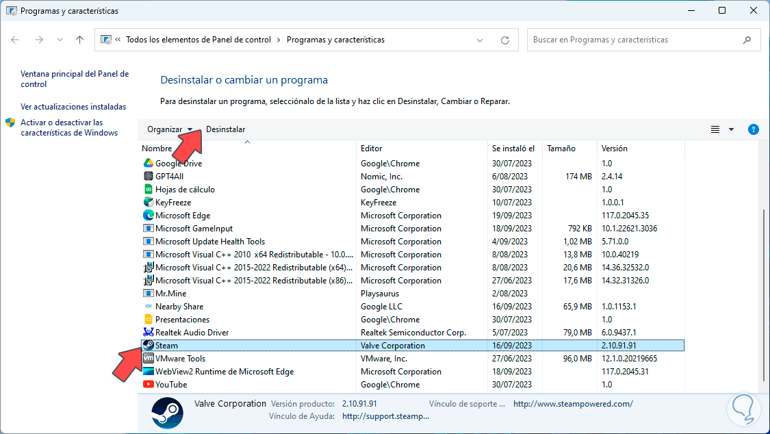 Sera abierta la ventana del Panel de control, allí seleccionamos de nuevo Steam y damos clic en “Desinstalar”: