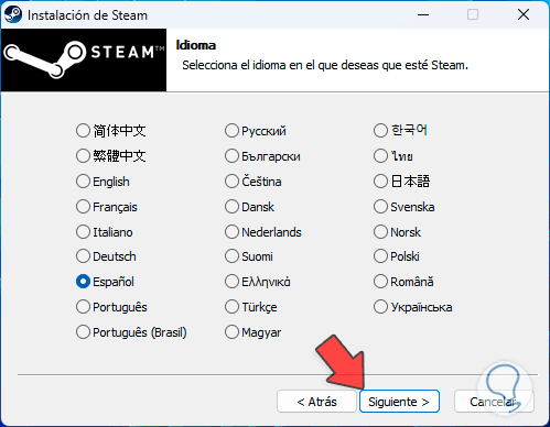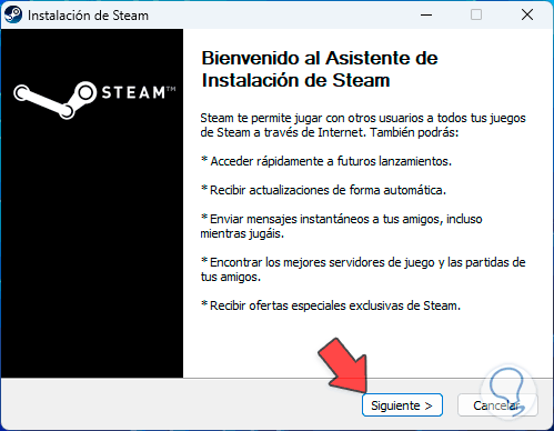 Ejecutamos el archivo descargado y se abre el asistente de instalación de Steam: