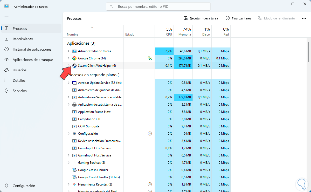 En el Administrador de tareas, seleccionamos el servicio de Steam:
