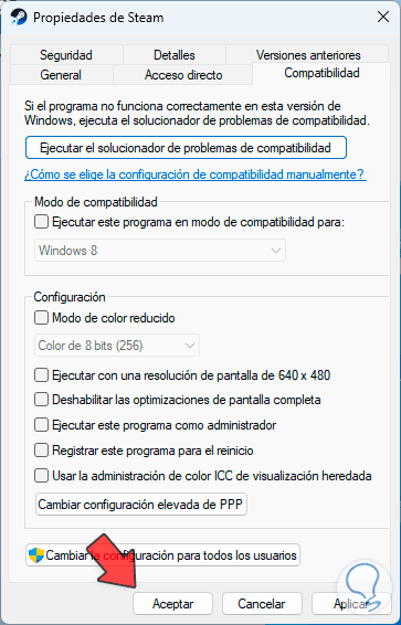 En la ventana emergente vamos a la pestaña “Compatibilidad”: