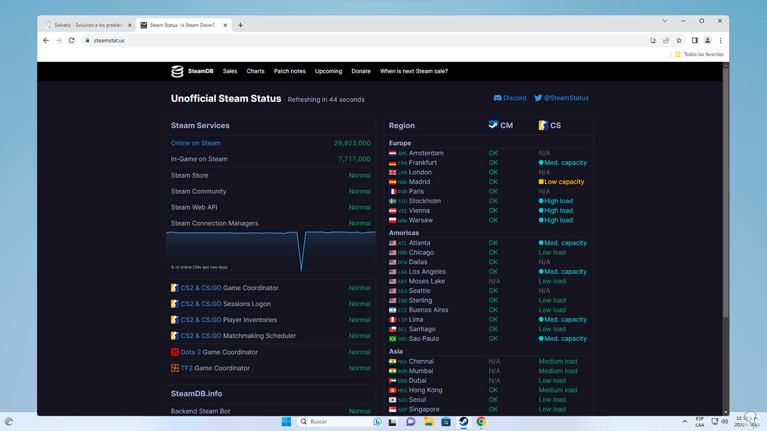 Si la causa es directamente en los servidores de Steam, será imposible que accedamos, es algo natural que en algún momento alguno de los servidores presente fallas, para revisar esto, iremos al siguiente enlace: