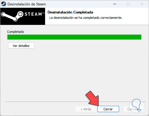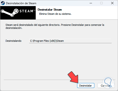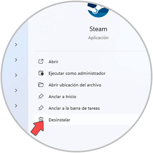 Si nada de lo anterior funciona, podemos reinstalar la aplicación, para ello en el buscador ingresamos “steam”, damos clic en “Desinstalar”: