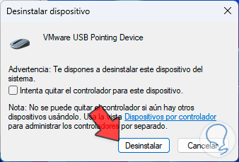 Pulsamos Enter sobre el controlador del mouse, con Tabulación vamos a la pestaña “Controlador” y con Tabulación vamos a “Desinstalar dispositivo”: