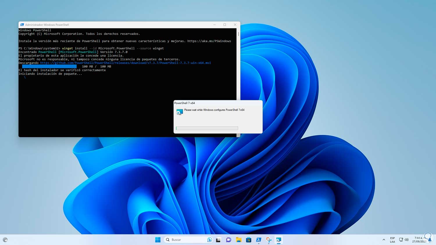 Allí podemos ver que se inicia todo el proceso de descarga, después de un momento, se lanzara el asistente de instalación de la version más reciente de PowerShell: