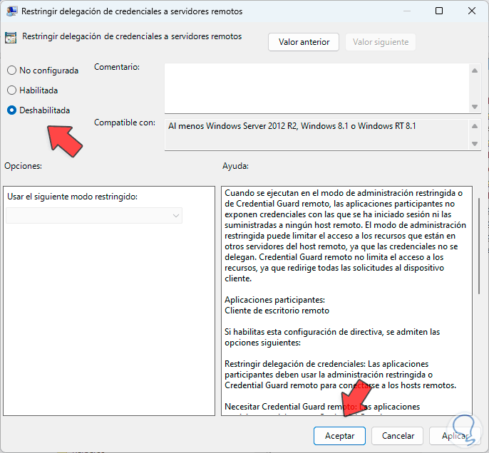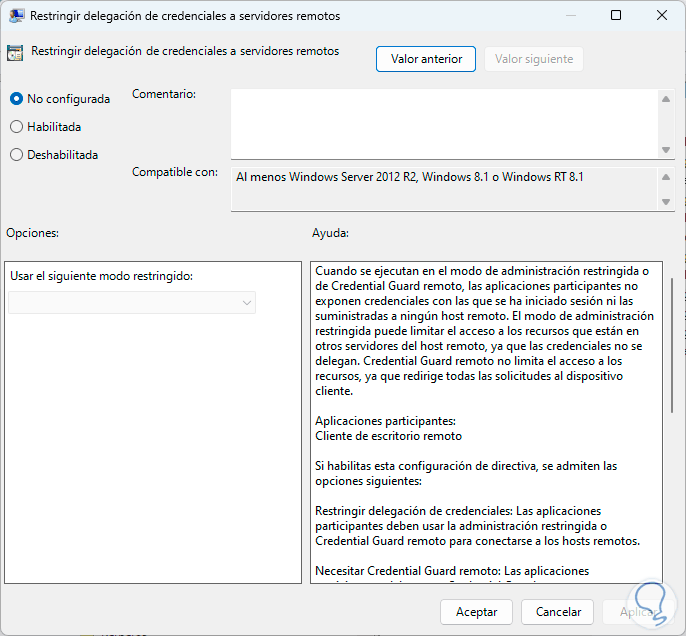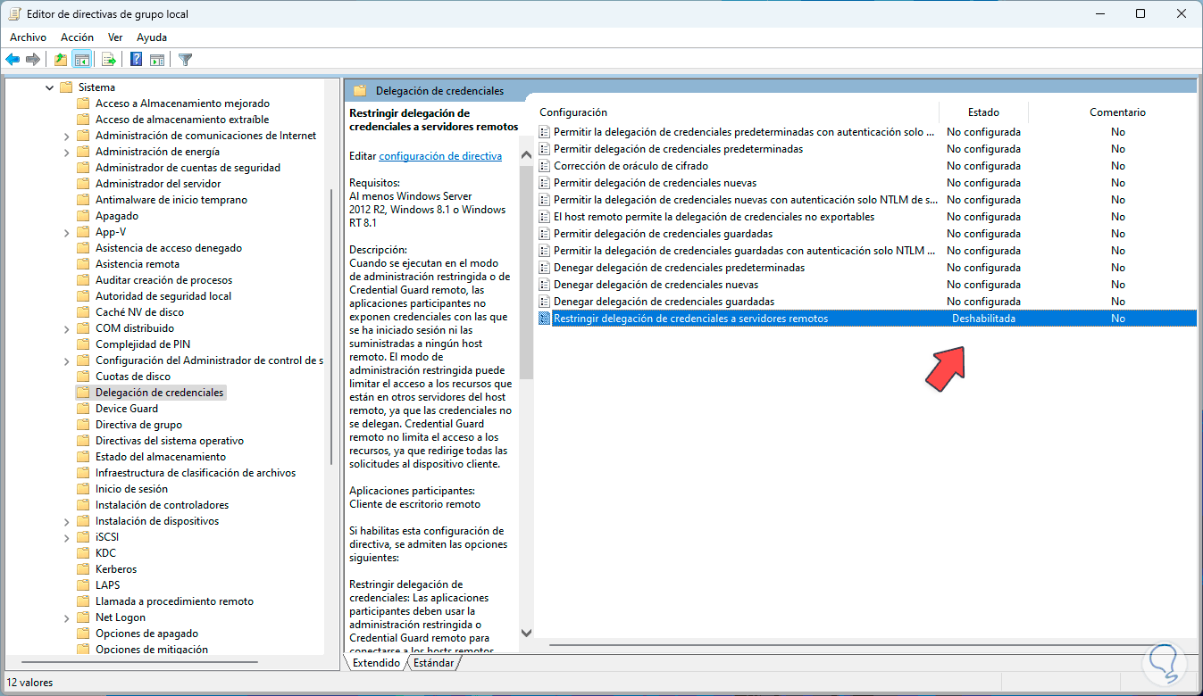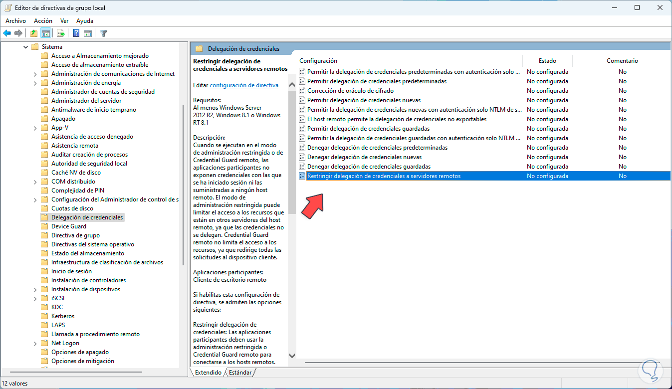 Aquí, vamos a seleccionar la política llamada “Restringir delegación de credenciales a servidores remotos”: