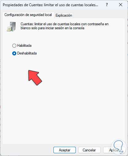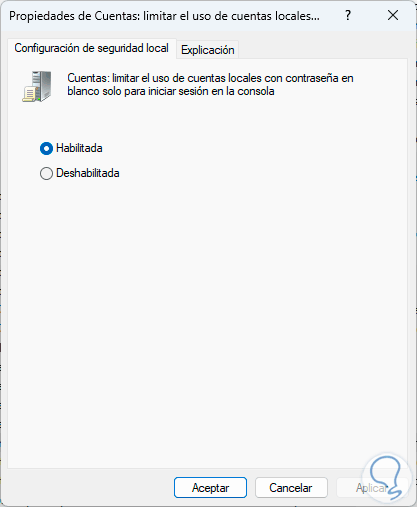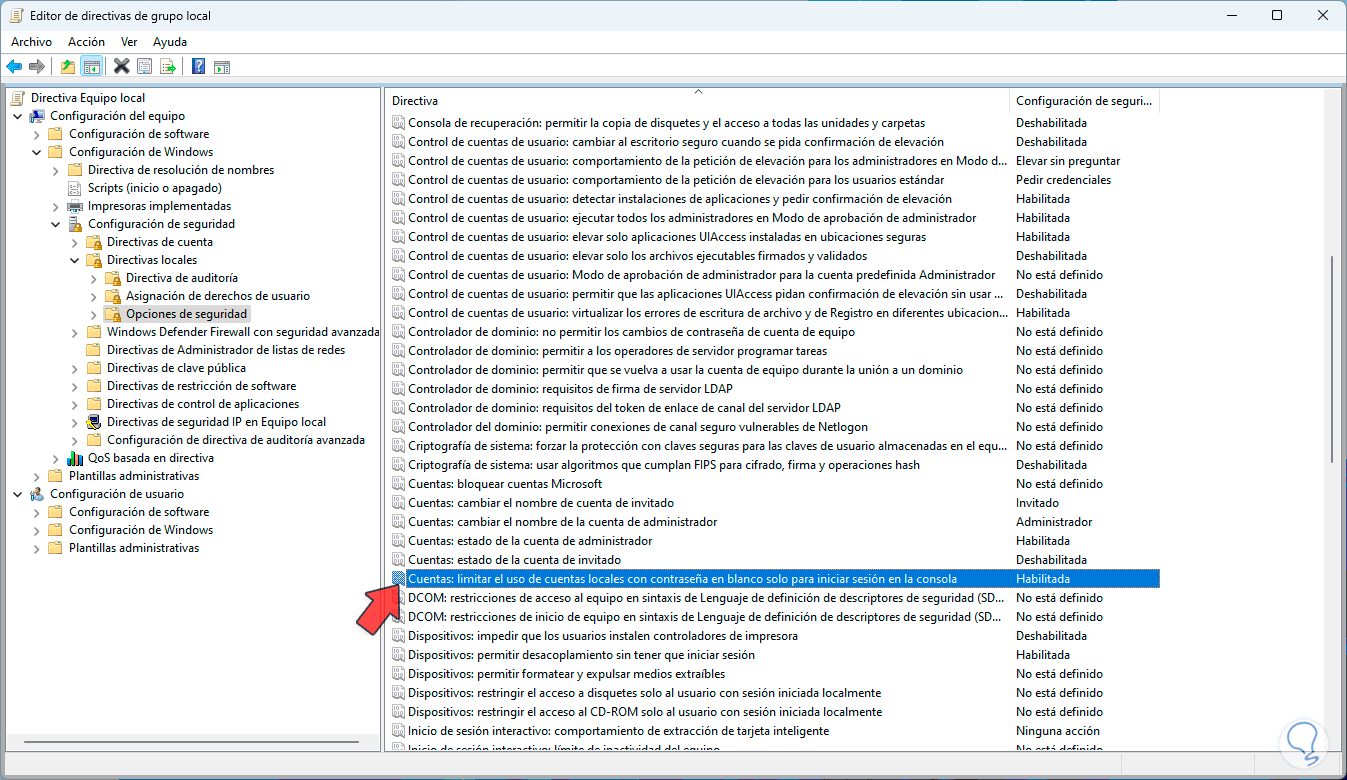 Allí, seleccionamos la política llamada “Cuentas: limitar el uso de cuentas locales con contraseña en blanco solo para iniciar sesión en la consola”: