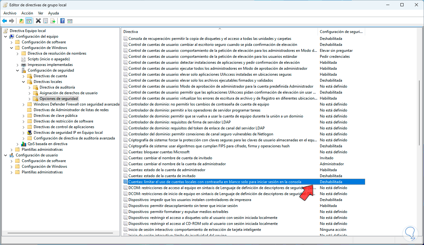 Configuración del equipo – Configuración de Windows – Configuración de seguridad – Directivas locales – Opciones de seguridad.