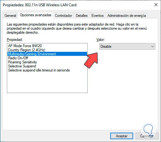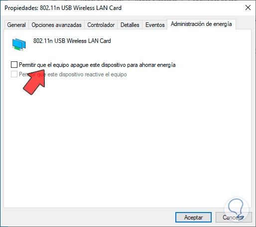 Vamos a desactivar la casilla “Permitir que el equipo apague este dispositivo para ahorrar energía”: