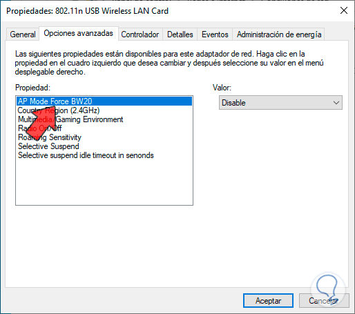 Después de esto, podemos seleccionar la región a usar en el campo “Country región (2.4 GHz), este es un valor nos permite especificar la región geográfica en la que cual trabaja el dispositivo de red inalámbrica, por defecto se establece la región que esta configurada en Windows 10 y debemos ser cuidados con cambiar este valor ya que cada país dispone de sus regulaciones sobre las frecuencias y potencias permitidas en los dispositivos inalámbricos: