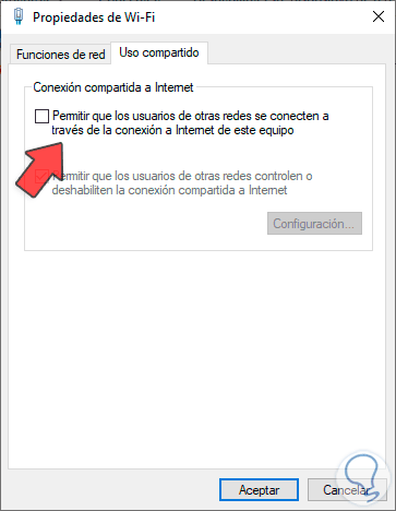 Allí debemos validar que la casilla “Permitir que los usuarios de otras redes se conecten a través de la conexión a Internet de este equipo”, la razón de esto, es evitar que a través de nuestro PC otros usuarios se conecten a Internet lo cual afecta la estabilidad, ancho de banda y demás factores que influyen en la conectividad.