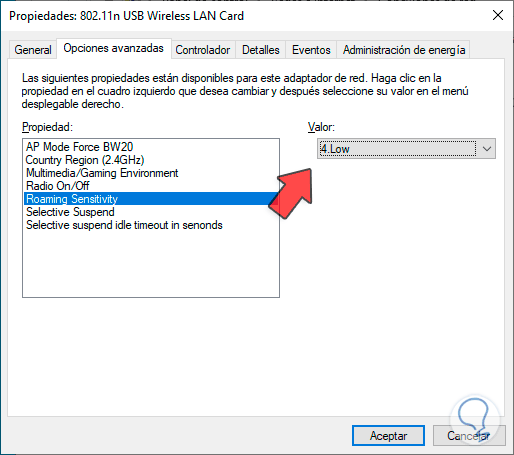 Con la opción “Roaming Sensitivity”, disponemos de la opción para configurar la velocidad con la cual el dispositivo se conecta o cambia de un punto de acceso a otro al momento de detectar una red inalámbrica, con este valor se determina la sensibilidad de roaming para ver qué tan sensible es el dispositivo a la calidad de la señal de un punto de acceso y con ello determinar si se requiere cambiar a otro punto de acceso en caso de que la calidad de la señal disminuya.