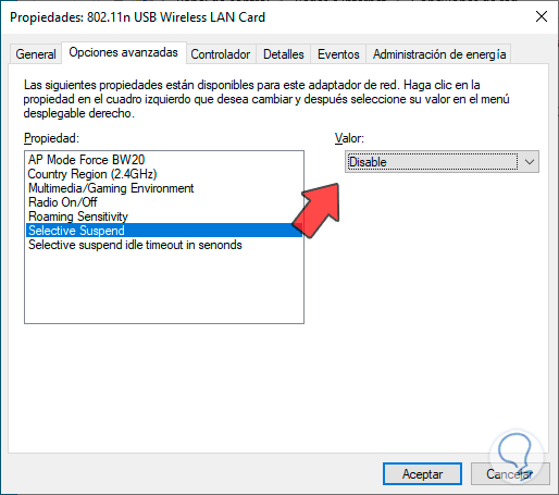 El campo “Selective Suspend”, es una función con la cual se permite al dispositivo Wi-Fi ser apagado usando el bajo consumo de energía, esto sucede cuando no se detecta uso o actividad por parte del dispositivo, lógicamente si se apaga el dispositivo no tendremos accedo a la red Wi-Fi obstruyendo su señal: