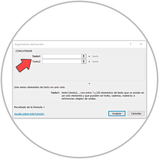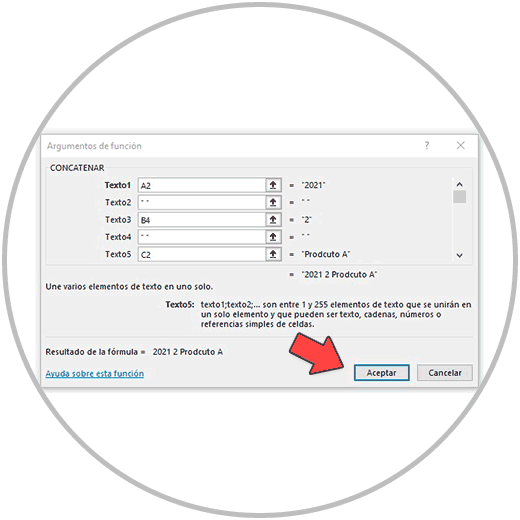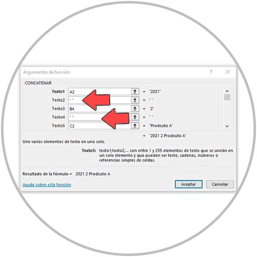 Ahora, en las cajas que vemos en el asistente, debemos ir introduciendo la información que necesita la función. Como estamos usando de ejemplo la función “CONCATENAR”, pues en cada caja, debemos ir seleccionado la información que queremos concatenar.