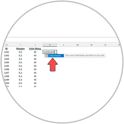 Si por ejemplo queremos usar la función “CONCATENAR”, a medida que vamos escribiendo la palabra encontrar después del igual, Excel nos dará la sugerencia de las funciones que coinciden con el texto escrito.