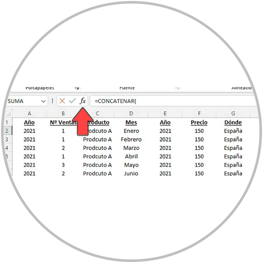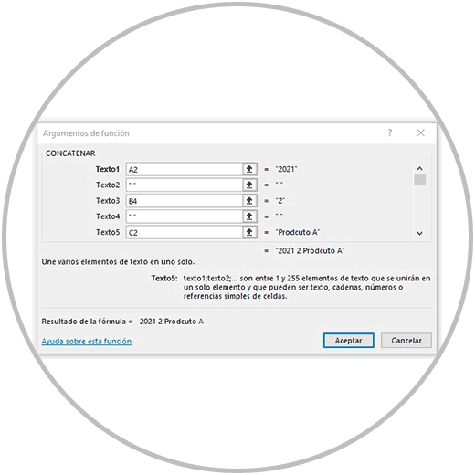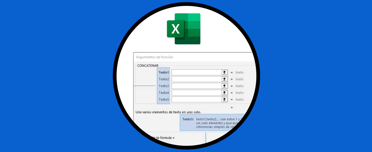 Así como hemos visto en la imagen de ejemplo, debemos ir proporcionando en cada caso la información o datos que cada función requiere. En este caso de ejemplo, hemos usado la función “CONCATENAR” para ver cuales son los argumentos de la función.