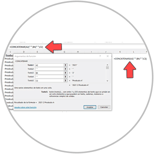 Así en la fórmula que estamos construyendo con la función concatenar con la ayuda del asistente “argumentos de función”, podemos ver como en la barra de fórmula (o en la propia celda donde estamos haciendo la fórmula), la fórmula se va creando con la información que estamos introduciendo en las cajas.