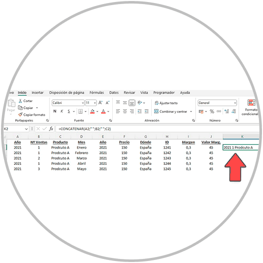 Y entonces ya veremos el resultado en la celda, en este caso el resultado después de usar la función “CONCATENAR” para construir una fórmula que unifique el contenido de varias celdas.