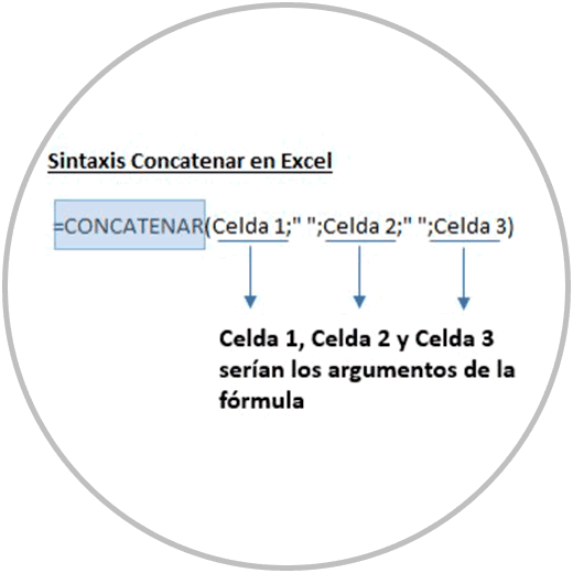 Así en esta imagen de ejemplo que acabamos de ver, donde vemos la sintaxis de una fórmula que usa la función “CONCATENAR”, podemos ver cómo cada información que introducimos en la fórmula (Celda 1, Celda 2, y Celda 3) serían los argumentos de la función.