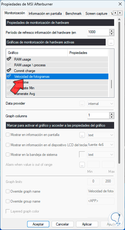 Allí vamos a seleccionar la línea “Velocidad de fotogramas”: