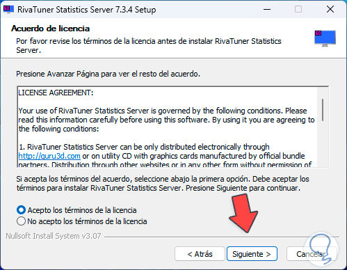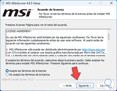 Damos clic en “Siguiente” y aceptamos los términos de la licencia: