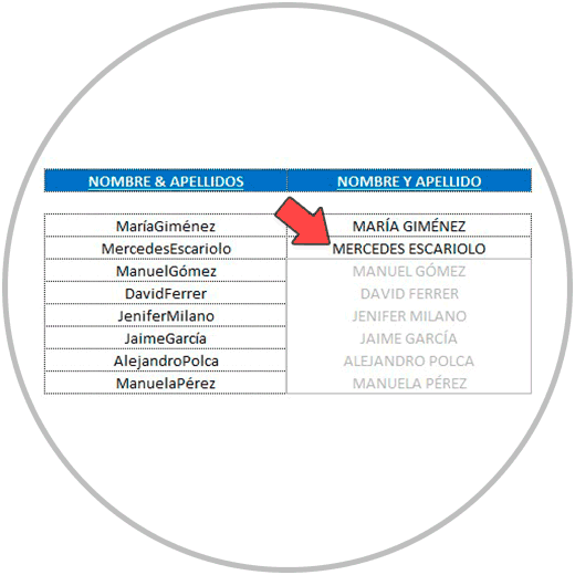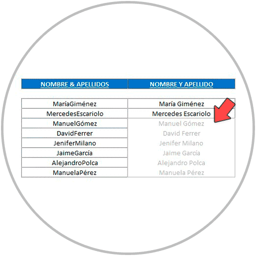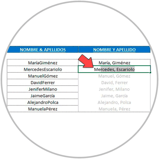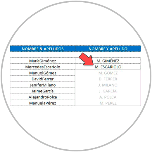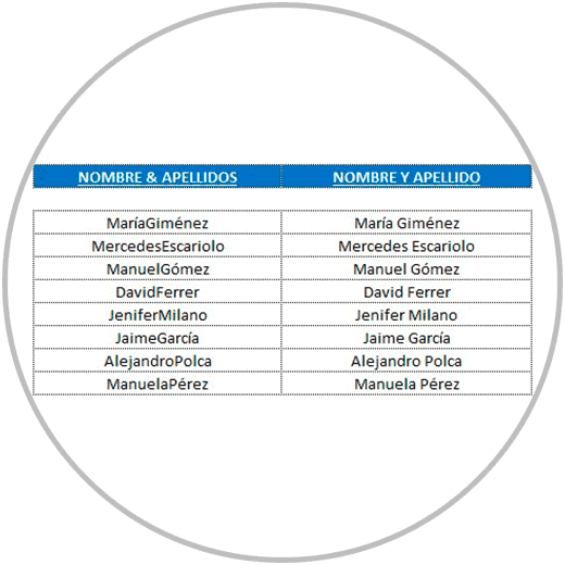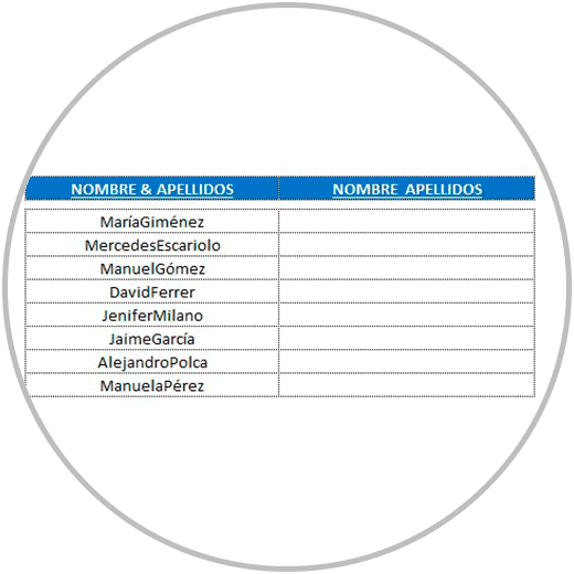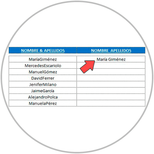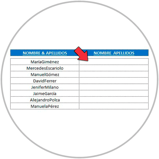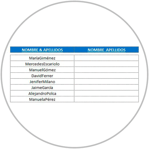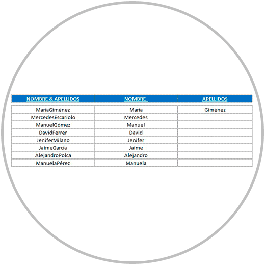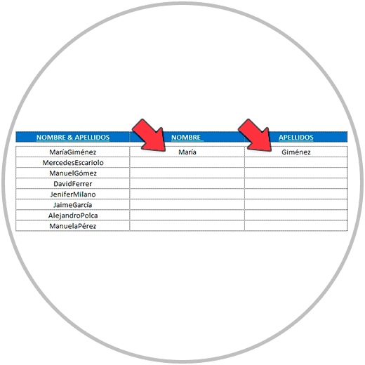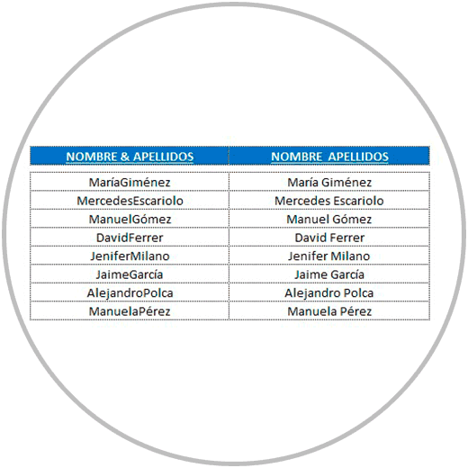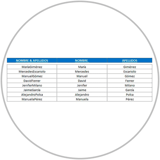 - En el ejemplo 2, hemos separado el nombre y apellido en celdas diferentes para que nombre y apellidos estuvieran el columnas diferentes
