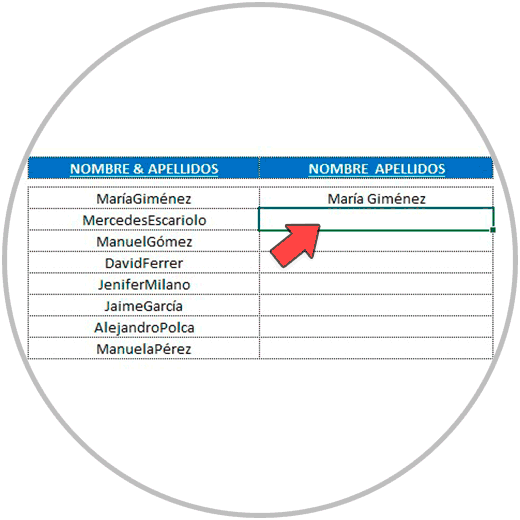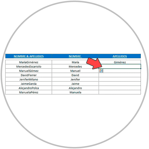 Ahora que ya hemos completado las columnas de los nombres, nos situamos debajo del apellido que hemos escrito a mano, en el ejemplo “Giménez”, en la celda que está inmediatamente abajo.
