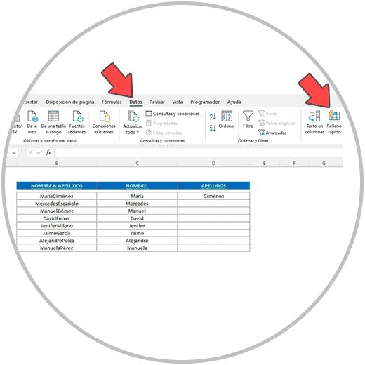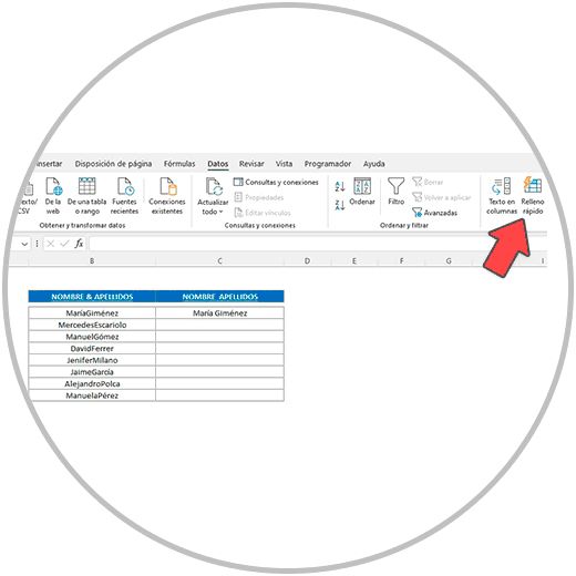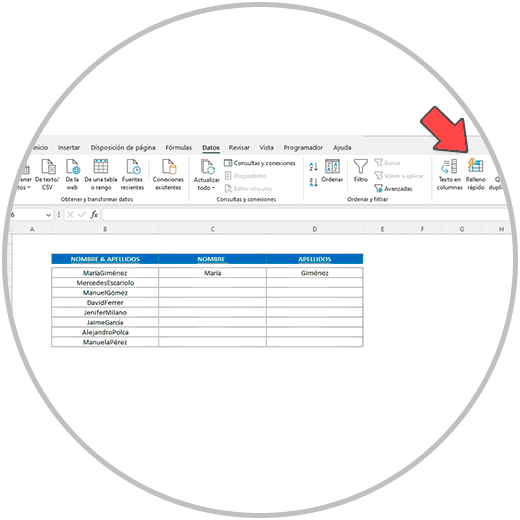 Ahora vamos a usar el “Relleno rápido” para completar la columna de los nombres, y después haremos lo propio para completar la columna de los apellidos.