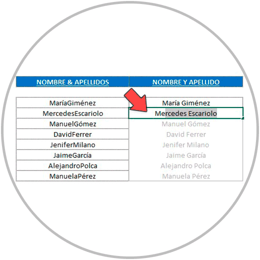 Como en el ejemplo, el primer y segundo nombre empiezan por la misma letra, la M (María y Mercedes), cuando en la celda de abajo escribimos Me, ya vamos a poder ver la sugerencia para completar la columna.