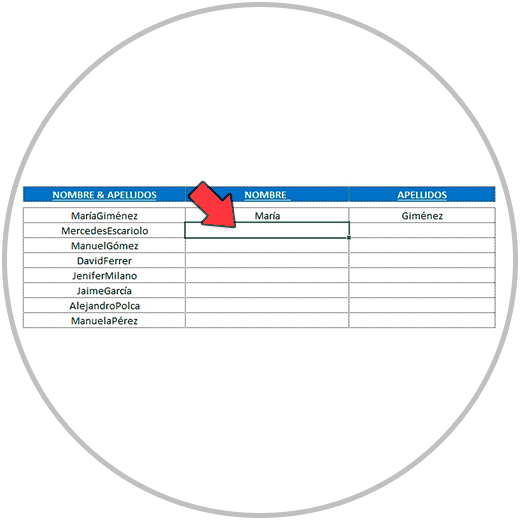 Por esta razón, vamos a "mostrar" a Excel la operación que queremos hacer con un ejemplo, para que pueda entender la lógica y aplicarla después. Vamos a realizar nosotros la separación del nombre y apellido en el primer alumno, que en el ejemplo sería María Giménez. Vamos a ver cómo se hace: