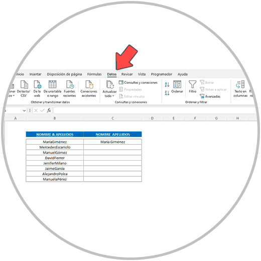 Una vez que nos hemos situado en la celda que está debajo del primer nombre, como en la imagen, nos vamos a la cinta de opciones de Excel y buscamos la pestaña “datos” donde haremos clic.