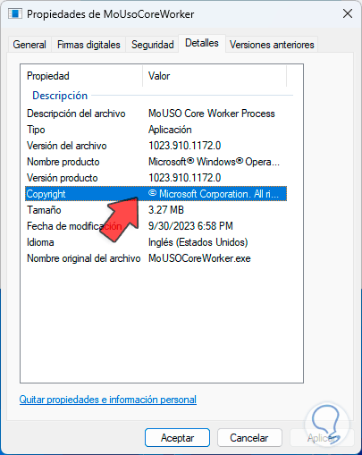 En primer lugar, iremos a la pestaña “Detalles”, allí en la línea “Copyright” vamos a verificar que sea algún propietario conocido, por lo general es Microsoft pero puede ser alguna otra empresa reconocida: