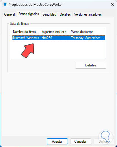 Luego vamos a la pestaña “Firmas digitales”, allí vamos a comprobar tanto el firmante como el algoritmo usado: