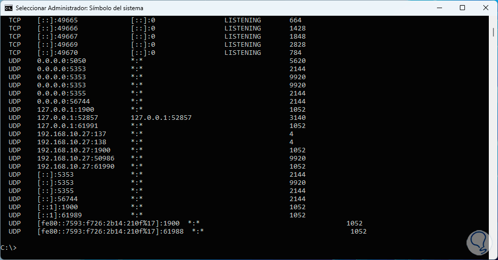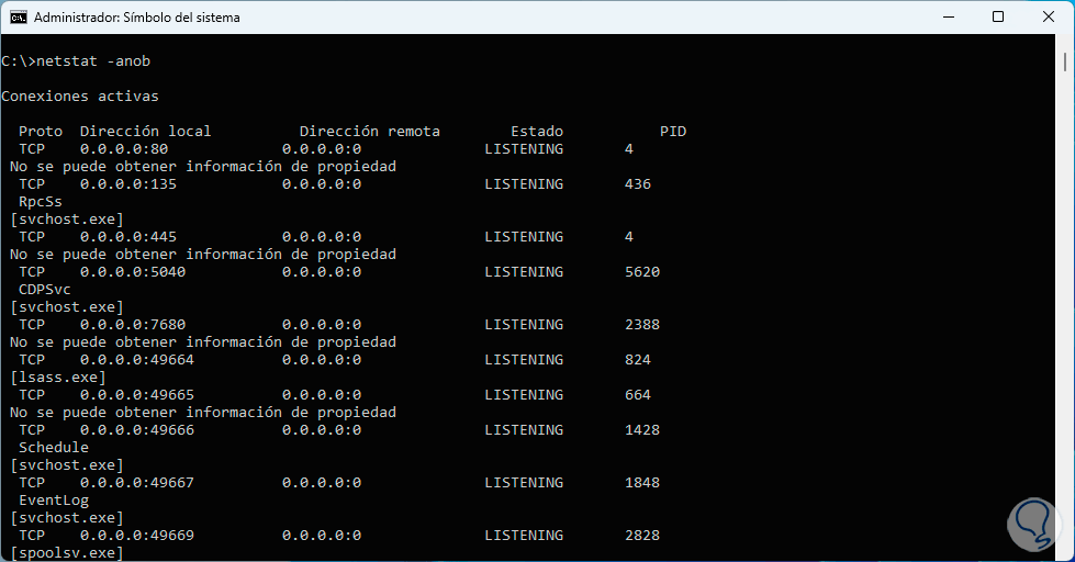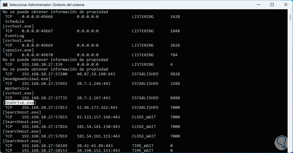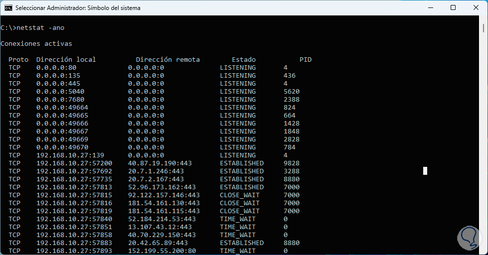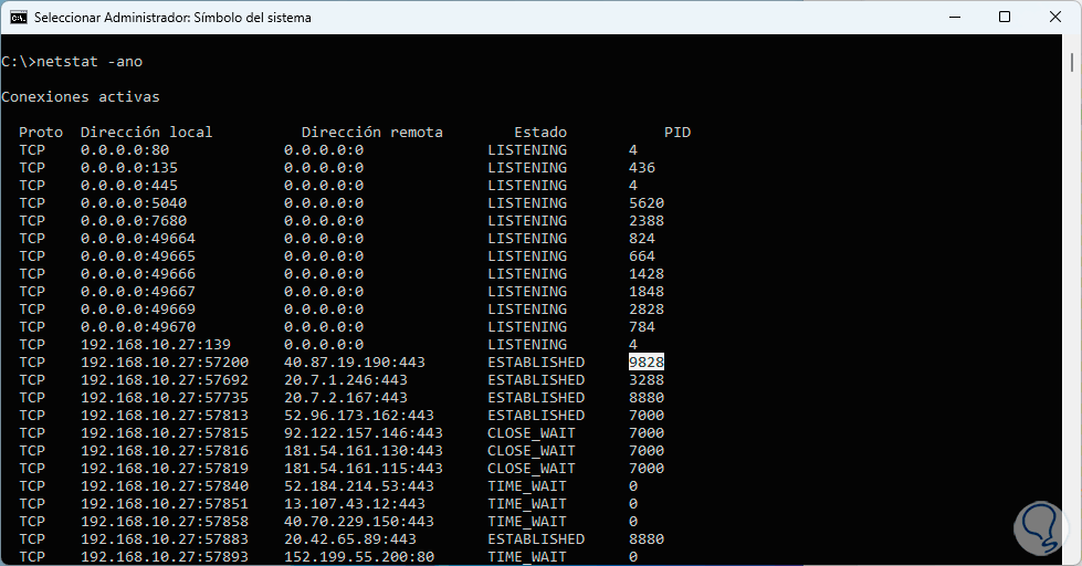 - -o: despliega las conexiones TCP activas añadiendo el identificador de proceso (PID) de cada conexión