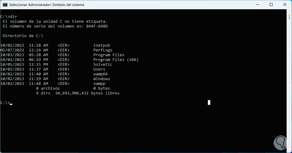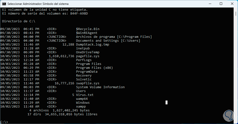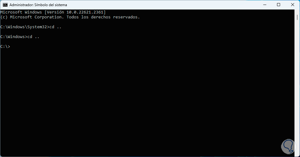 En la consola, vamos a usar la línea “cd ..” para llegar a la raíz de la unidad C: