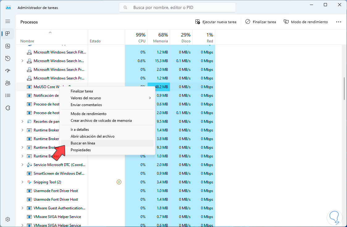 Podemos salir de esta ventana. Finalmente, para una información mucho mas completa, damos clic derecho sobre el proceso y seleccionamos “Buscar en línea”: