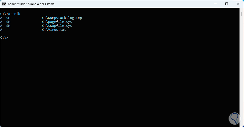 Con el comando “attrib” validamos que haya sido borrado: