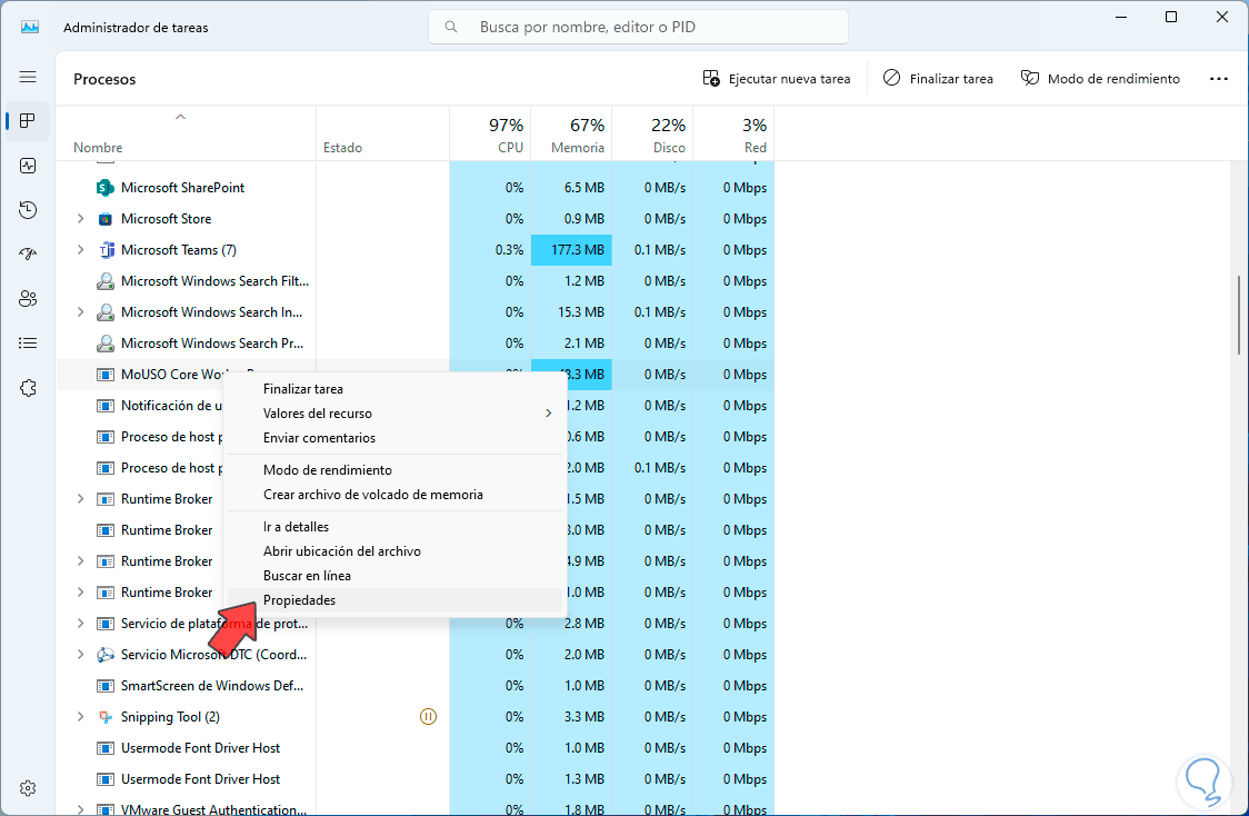 Si por este lado no encontramos errores, daremos de nuevo clic derecho sobre el proceso y esta vez seleccionamos la opción “Propiedades”: