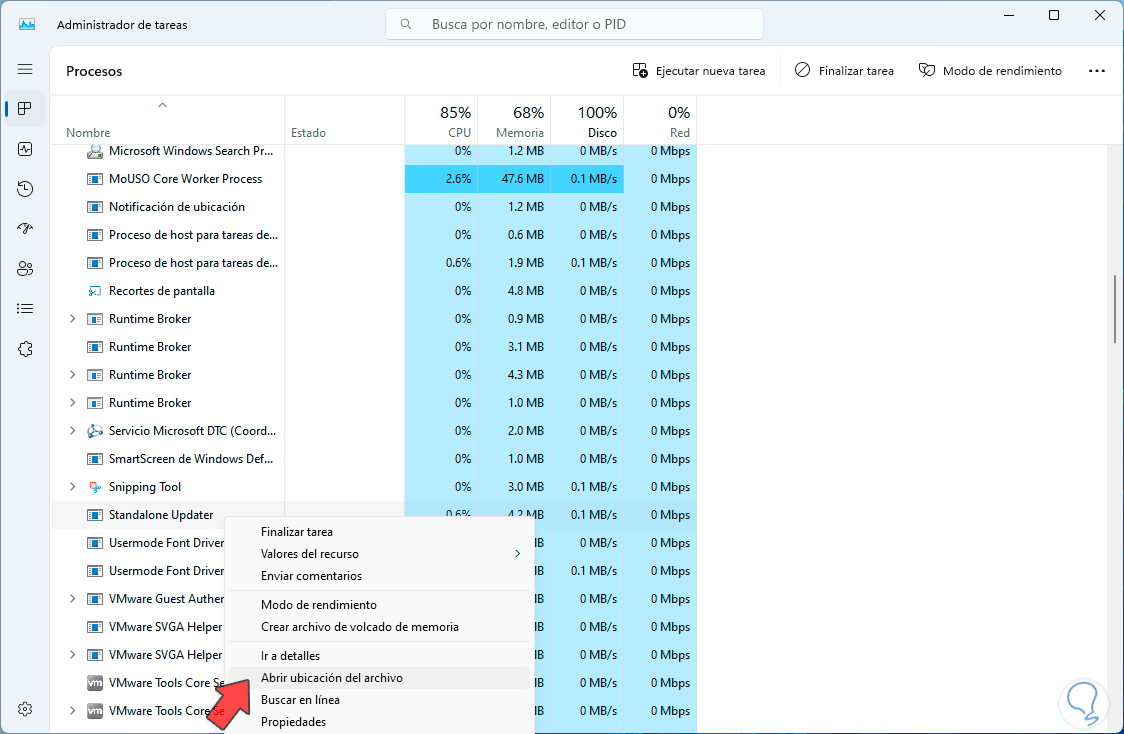 Cuando se abra el Administrador, iremos a la sección de procesos para buscar alguno que no se detecte como fiable, si llegamos a ver alguno, damos clic derecho sobre él y seleccionamos la opción “Abrir ubicación del archivo”: