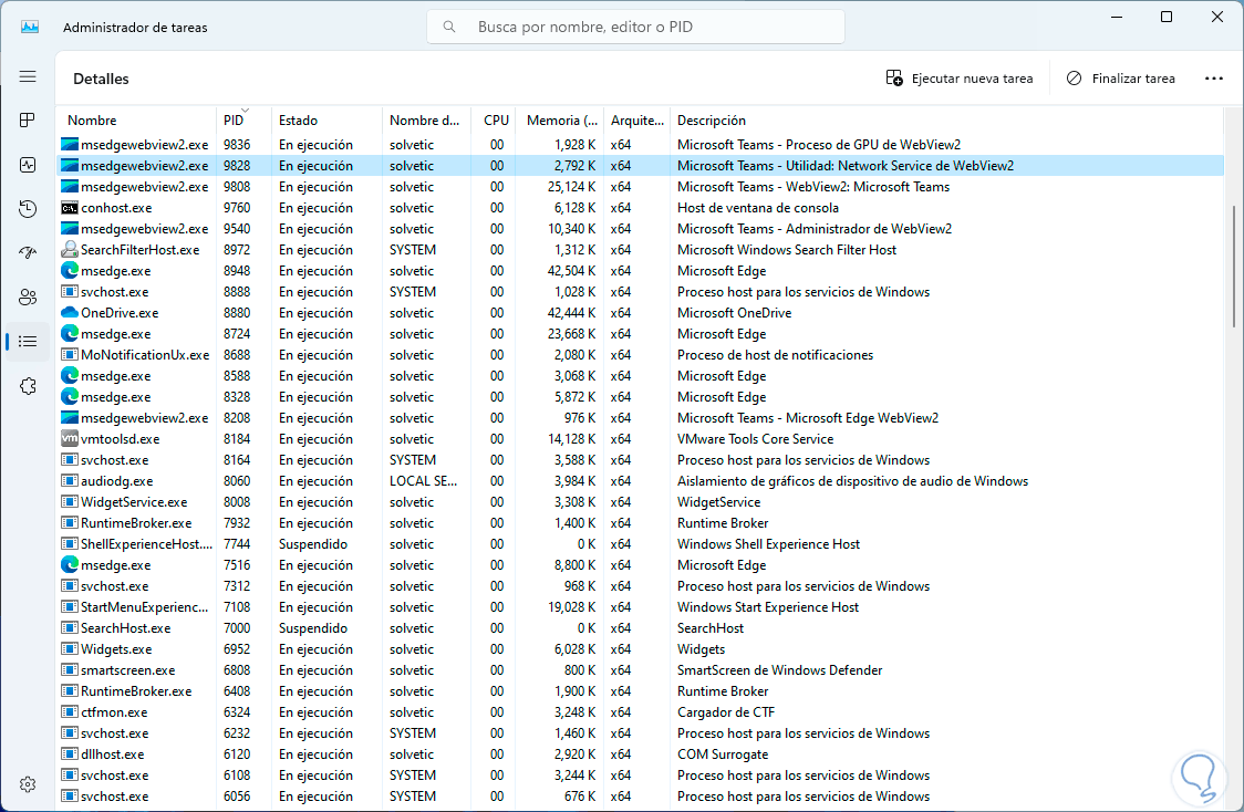 Luego, en el Administrador de tareas, vamos a la sección “Detalles” y buscamos ese PID a que aplicación o proceso hace referencia: