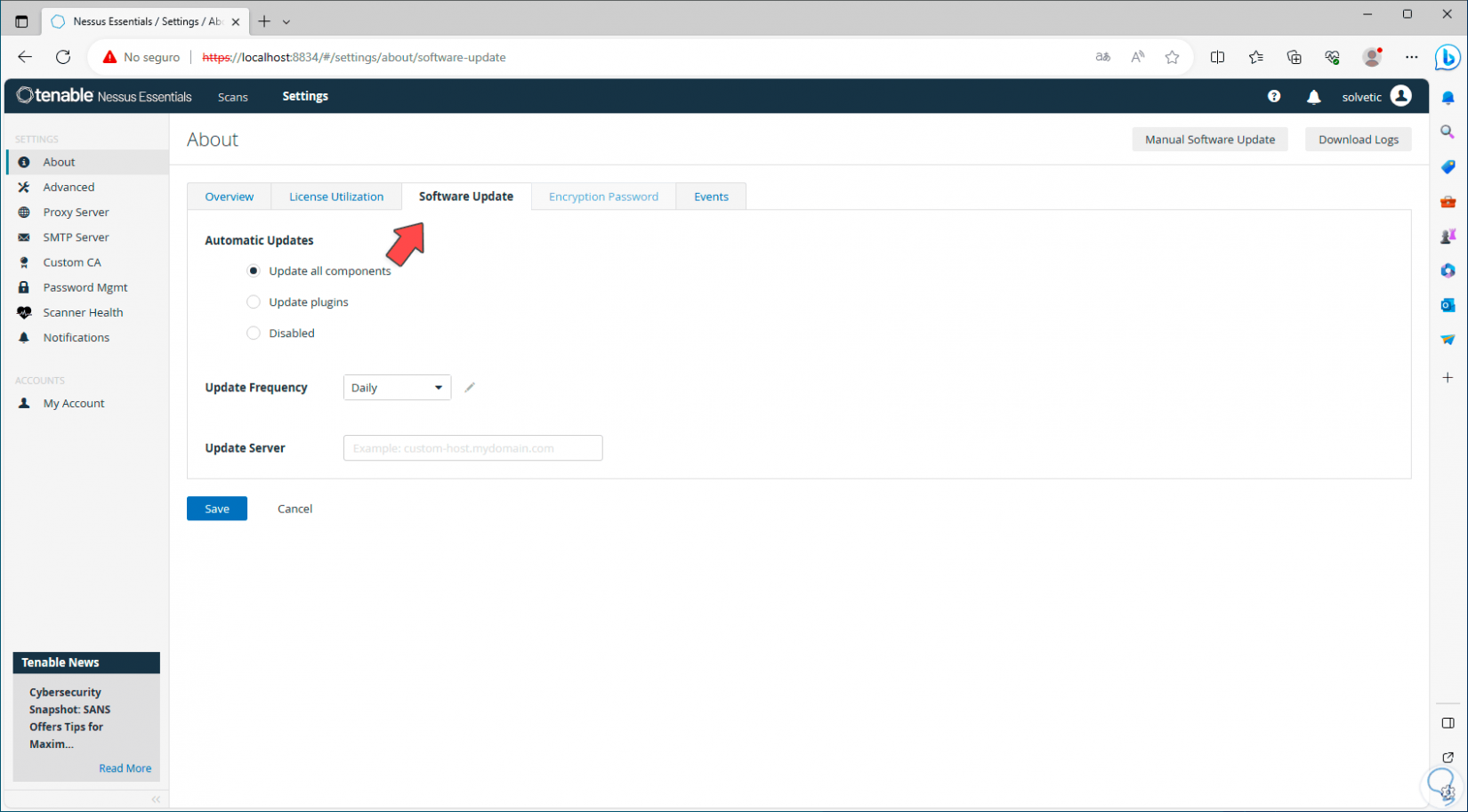 En el caso de la actualización de Nessus podremos definir tanto la frecuencia como si se hará automática o manual: