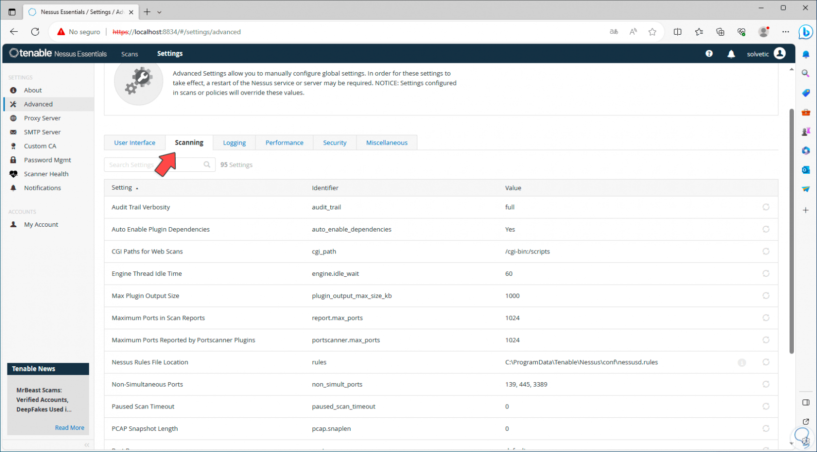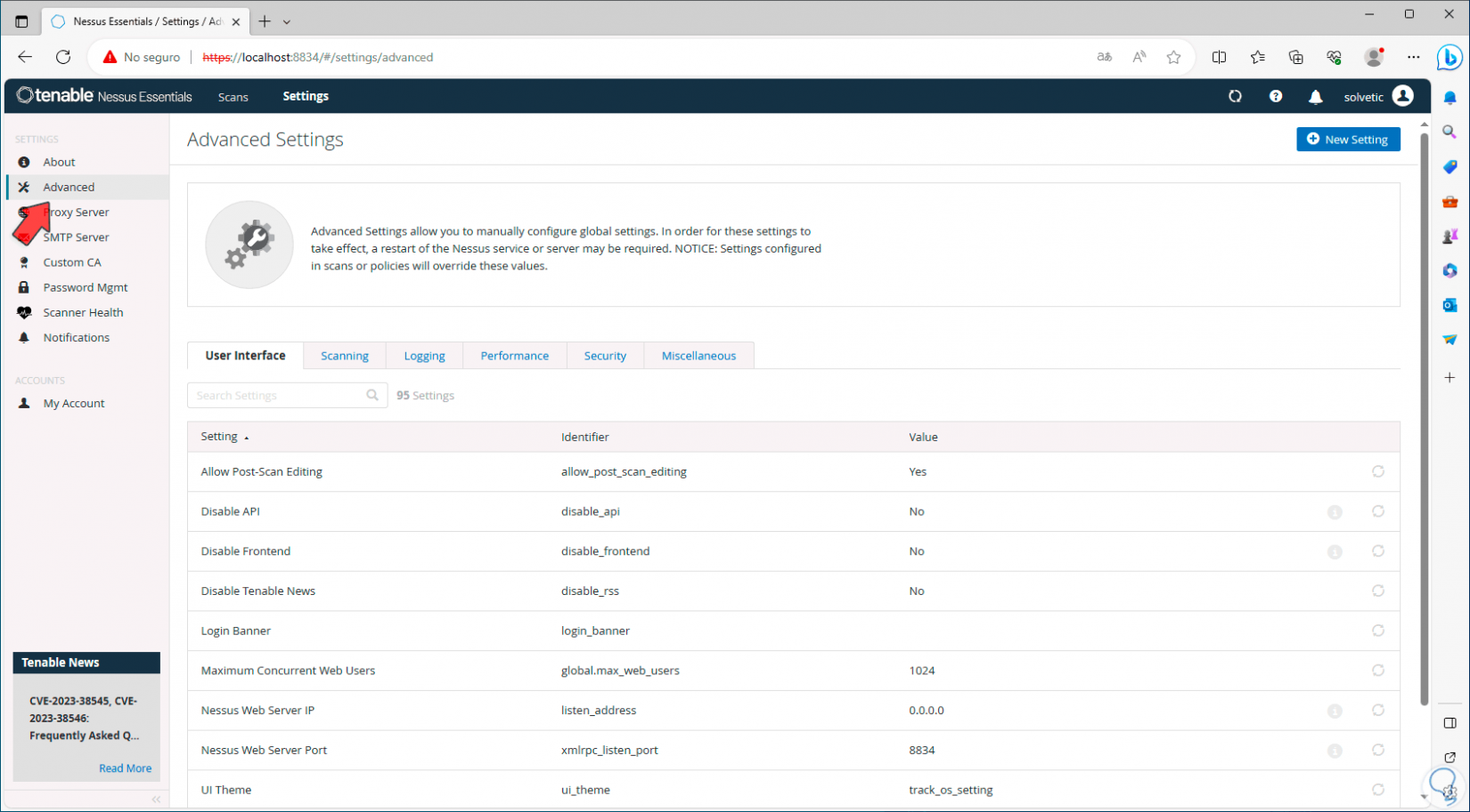 Ahora, en la sección “Advanced”, será posible configurar de forma global los parámetros de Nessus, en “User interface” podremos ver cada parámetro disponible: