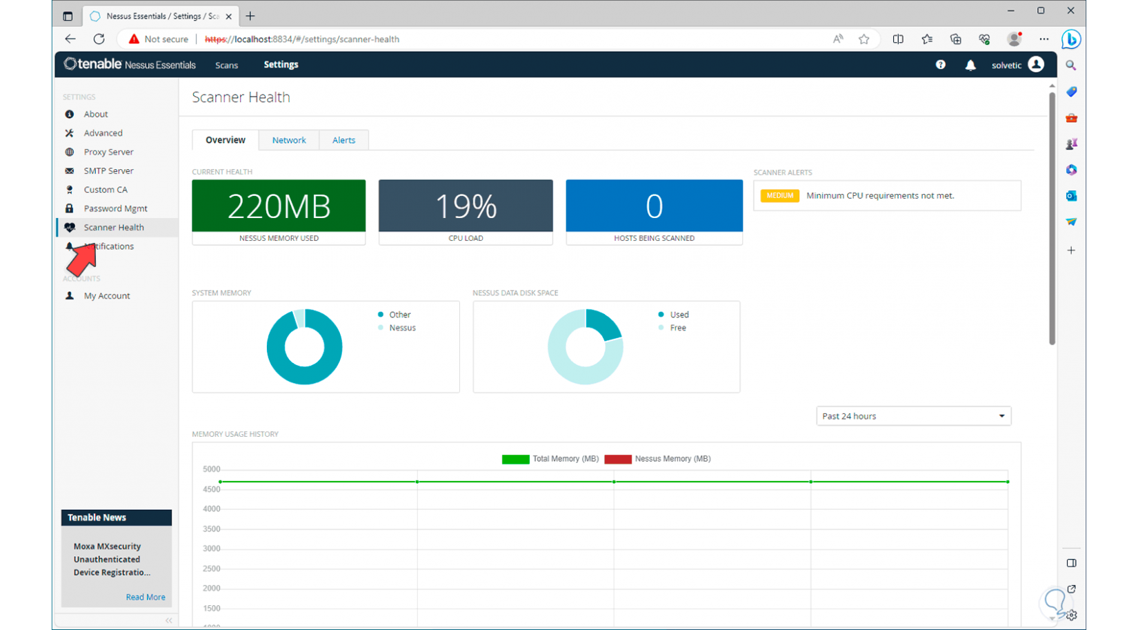 Para tener acceso en tiempo real al estado del sistema, damos clic en la sección “Scanner health”. Veremos la carga de memoria usada por la aplicación, el porcentaje de uso de CPU, espacio en disco y más detalles.